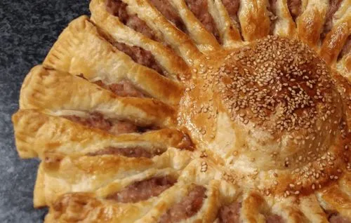 5- Confeccionamos los pétalos de nuestro volcán. Para ello, cortamos unidades cada cuatro dedos y damos un giro de 90º. Pintamos con la yema de un huevo y decoramos con semillas de sésamo.