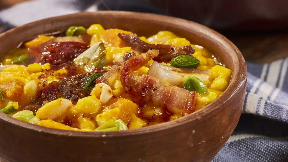 Su origen se remonta a los pueblos originarios de la región andina, quienes ya cocinaban preparaciones a base de maíz, zapallo y porotos. Con la llegada de los españoles, se sumaron carnes y embutidos, dando lugar a la versión criolla que hoy conocemos y que varía según la región y la mano de quien lo cocina.