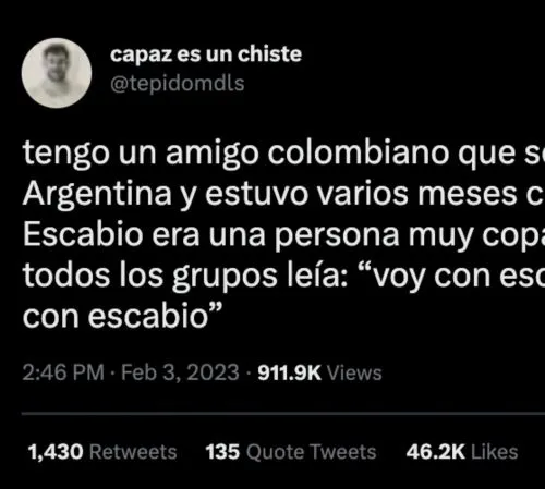 "Tengo un amigo colombiano que se vino a vivir a Argentina y estuvo varios meses creyendo que Escabio era una persona muy copada porque en todos los grupos leía: “Voy con escabio” o “Vengan con escabio”", escribió el usuario viral.