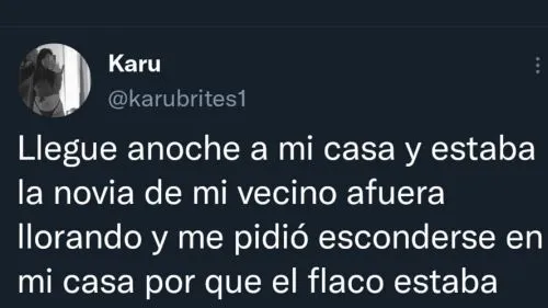 Lo cierto es que ella se quedó inmóvil al ver a una mujer junto a su novio y decidió pedirle ayuda a la vecina de al lado. “Llegue anoche a mi casa y estaba la novia de mi vecino afuera llorando y me pidió esconderse en mi casa porque el flaco estaba con otra mina adentro. Le hice el aguante”, sostuvo Karen Brites, al comenzar a relatar la triste historia que fue furor en las redes sociales.