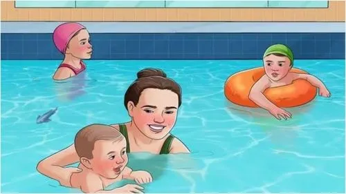 En la escena se puede visualizar rápidamente dos nenes a los costados de la pileta, y una mujer enseñándole a nadar a un nene más chiquito, en una situación típica del verano.