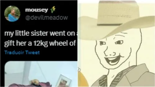 En las imágenes, además, la usuaria sumó un meme en referencia a la curiosa anécdota. En la foto se aprecia un joven hombre con un sombrero de vaquero “yanqui”, y le regala la rueda de queso a una joven que aparenta algo sorprendida con la situación.