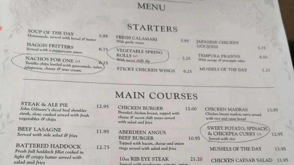 La señora, llamada Lisa Cooney, había ido a comer a un restaurante llamado Ravelston House, para cenar con su familia y le preguntó al camarero si había un menú con comida vegana. Tras eso, el empleado le conestó que iba a preguntárselo al chef. Cuando el mozo volvió, le trajo un menú con los platos veganos marcados con un círculo.
