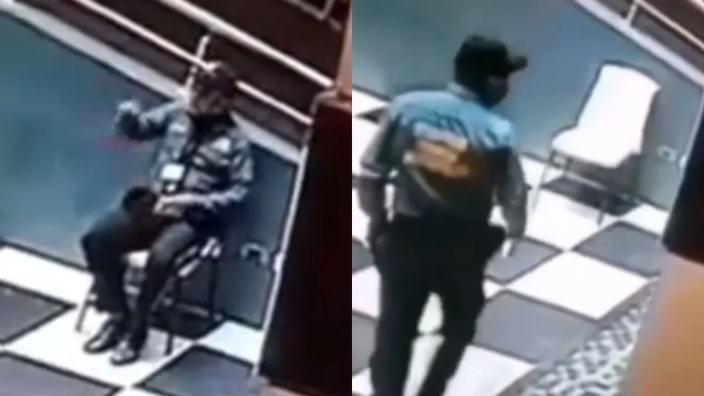 En las imágenes se observa al guardia sentado en su puesto mientras revisa su celular. En un momento, levanta la mirada y saluda a alguien; ambos chocan los puños y se quedan charlando por varios minutos, hasta que la otra persona, aparentemente parte del equipo de limpieza, se retira del lugar.