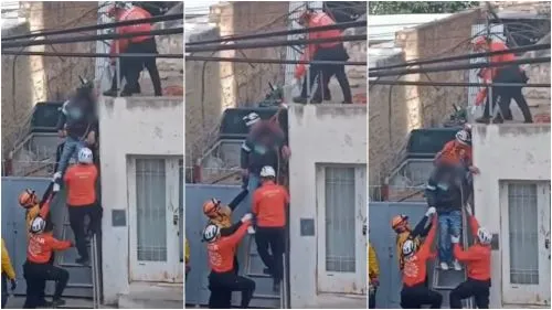 Según se puede ver en las imágenes del insólito hecho, los bomberos tuvieron que asistirlo para sacarlo de la terrible situación.