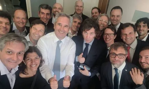 Allí, Milei saludó a varios de los trabajadores, con los que se tomó una foto, mientras que alentó al equipo económico encargado de explicar los números previstos para el 2025, y destinó gran parte del mediodía a almorzar entrañas con ensalada con Caputo.