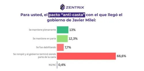 Ante la consulta, "Para usted, el pacto anti casta con el que llegó el gobierno de Javier Milei", la opción más elegida con el 66,6% fue "se rompió y el gobierno terminó siendo parte de la casta".